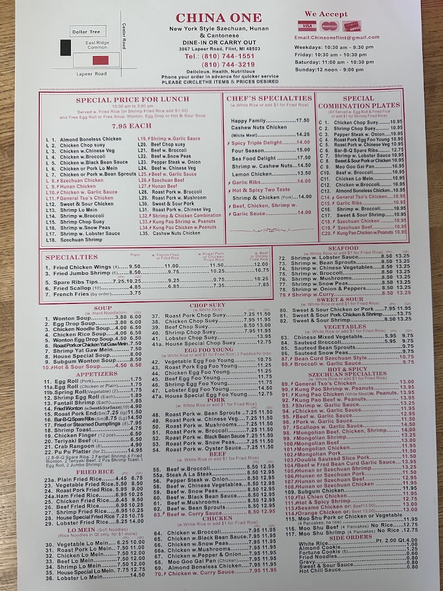 "China 1, located at 3867 Lapeer Rd Flint, MI 48503, offers a diverse menu with a range of authentic Chinese dishes. From appetizers like Egg Rolls and Shrimp Toast to Chef's Specialties like Happy Family and Seafood Delight, there is something for everyone. Customers rave about the quality and affordability of the food, with reviews praising dishes like Chicken Wings, Lo Mein, and Hot and Sour Soup. The restaurant also caters to specific preferences, as seen in a review where the owner accommodated a request for egg rolls without pork. While some customers mention minor issues like the need for more flavor in the fried rice or adjustments to ingredient ratios in dishes like Mongolian Beef, overall, China 1 seems to be a go-to spot for delicious Chinese takeout."